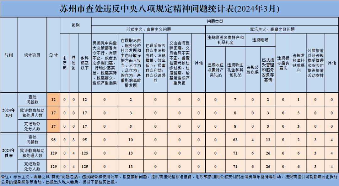 为掌握全市贯彻落实中央八项规定精神情况,市纪委监委在各县级市(区)和市级机关、市属单位等建立了落实中央八项规定精神情况月报制度,每月定期向社会发布全市查处“四风”问题情况,释放落实中央八项规定精神越往后盯得越紧、执纪越严的强烈信号,推动党风政风和社会风气持续好转。2024年3月,全市查处违反中央八项规定精神问题情况如下: