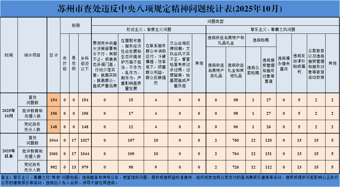 为掌握全市贯彻落实中央八项规定精神情况,市纪委监委在各县级市(区)和市级机关、市属单位等建立了落实中央八项规定精神情况月报制度,每月定期向社会发布全市查处“四风”问题情况,释放落实中央八项规定精神越往后盯得越紧、执纪越严的强烈信号,推动党风政风和社会风气持续好转。2025年10月,全市查处违反中央八项规定精神问题情况如下: