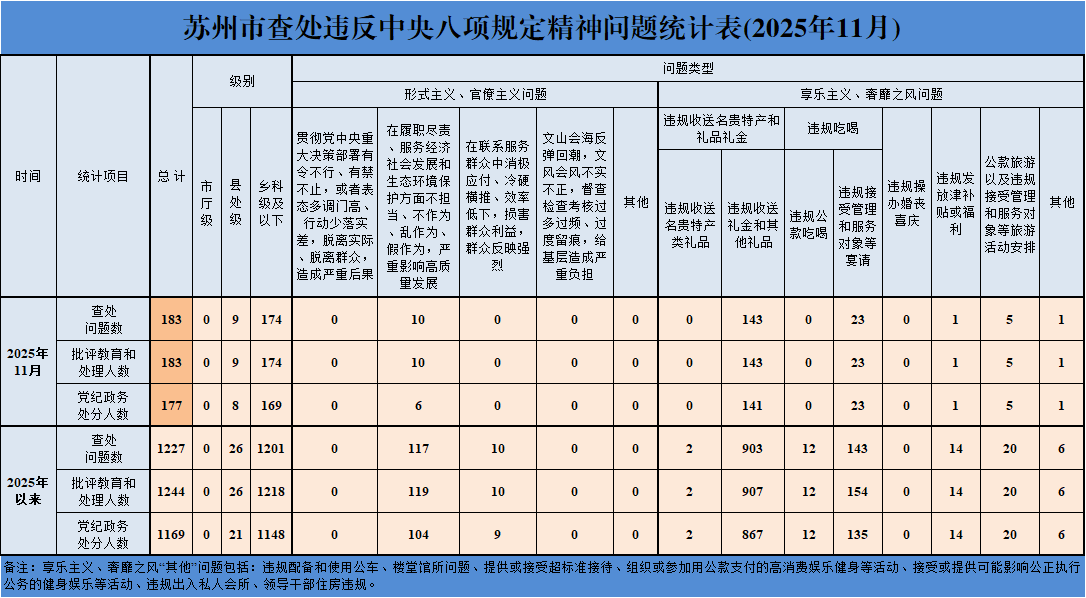 为掌握全市贯彻落实中央八项规定精神情况,市纪委监委在各县级市(区)和市级机关、市属单位等建立了落实中央八项规定精神情况月报制度,每月定期向社会发布全市查处“四风”问题情况,释放落实中央八项规定精神越往后盯得越紧、执纪越严的强烈信号,推动党风政风和社会风气持续好转。2025年11月,全市查处违反中央八项规定精神问题情况如下: