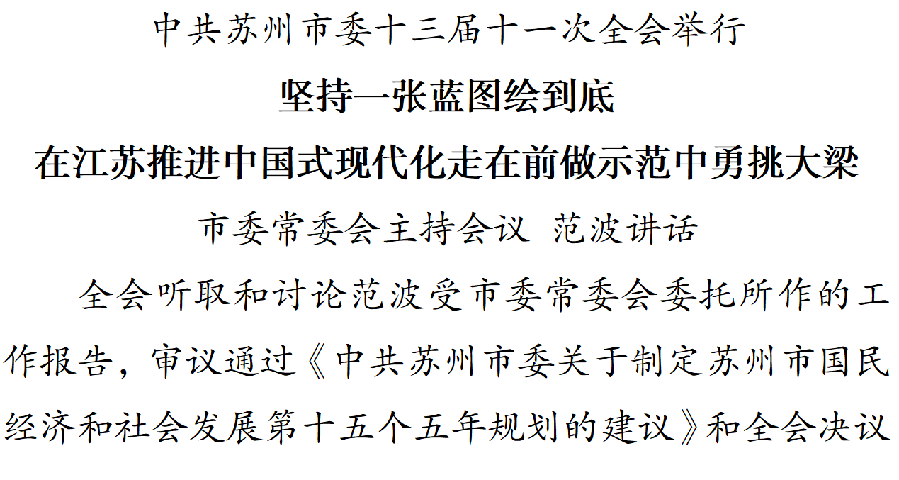 12月17日,中国共产党苏州市第十三届委员会第十一次全体会议在市会议中心召开。全会坚持以习近平新时代中国特色社会主义思想为指导,深入学习贯彻党的二十届四中全会、中央经济工作会议精神以及习近平总书记对江苏、苏州工作重要讲话重要指示精神,落实省委十四届十次全会部署,听取和讨论市委书记范波受市委常委会委托所作的工作报告,审议通过《中共苏州市委关于制定苏州市国民经济和社会发展第十五个五年规划的建议》《中国共产党苏州市第十三届委员会第十一次全体会议决议》,审议了《中共苏州市委常委会2025年度落实全面从严治党主体责任情况的报告》。
